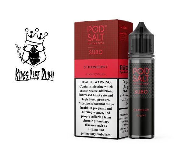 A refreshing Pod Salt Subo Strawberry flavored nicotine salt e-liquid made for a glacial vaping experience.