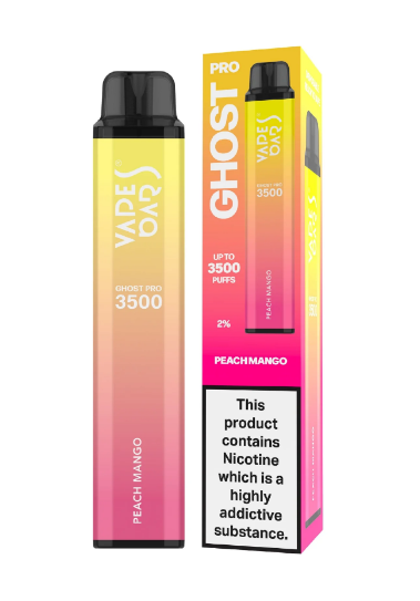 Vapes Bar Ghost Pro Mango Peach 3500pfs is compact and comfortable mouthpiece with a medium-tight draw ensures smooth yet powerful hits without any throat irritation and elegant feel and is designed to providing a satisfying cloud of flavor-saturated goodness with a 650mah rechargeable battery for long lasting use something our customers love.Ghost Pro is the newest disposable from the Vapes bar which lasts longer and with stylish design and All flavors available at king vape dubai.